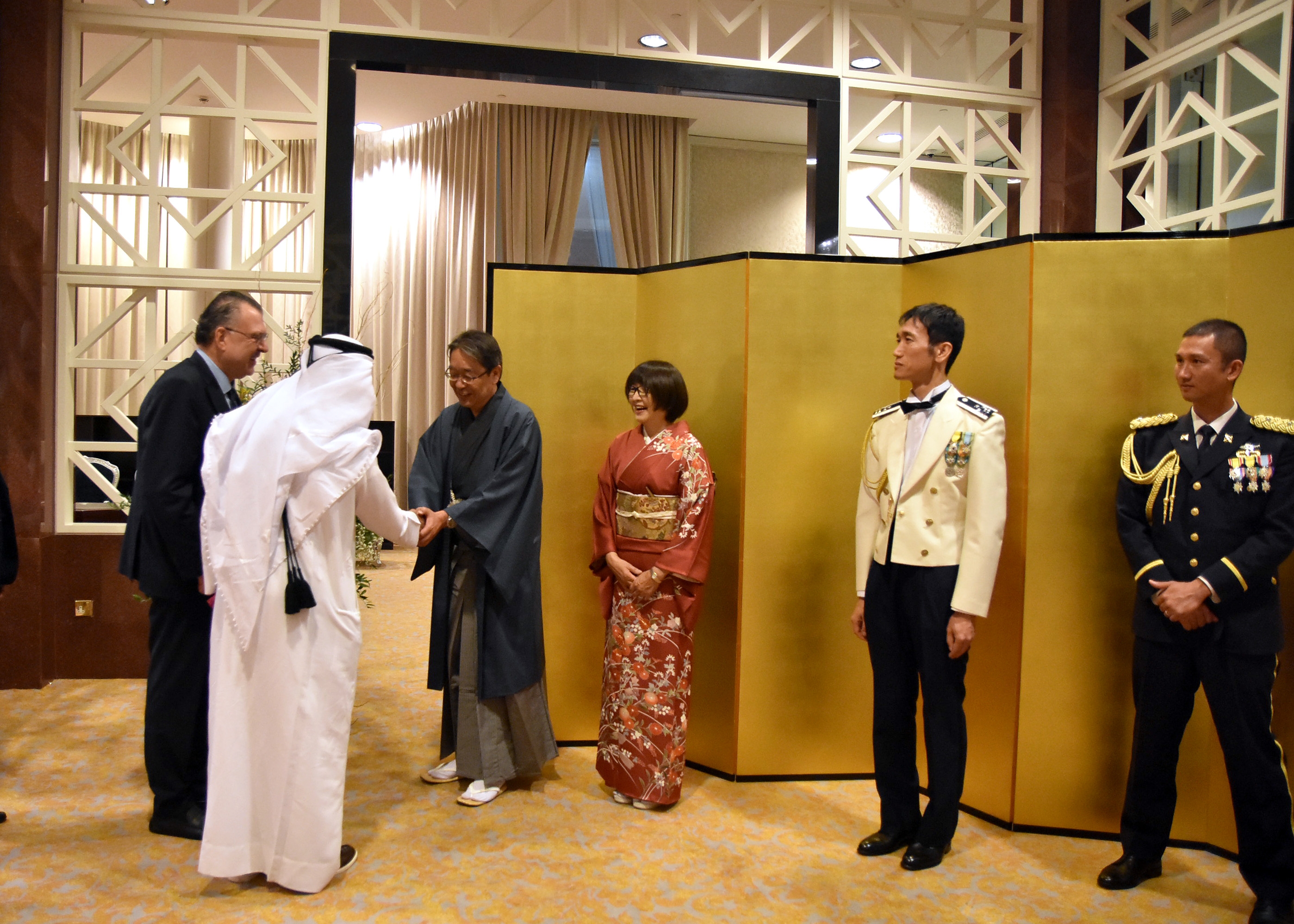 Ambassador Naoto Hisajima hosted a festive reception at the Ritz-Carlton Doha to celebrate the 65th birthday of His Majesty the Emperor. The reception was attended by HE Sheikh Faisal bin Thani bin Faisal Al Thani, Minister of Commerce and Industry, HE Mr. Ibrahim Fakhro, Director General of the Department of Ceremonies of the Ministry of Foreign Affairs, and approximately 350 guests.