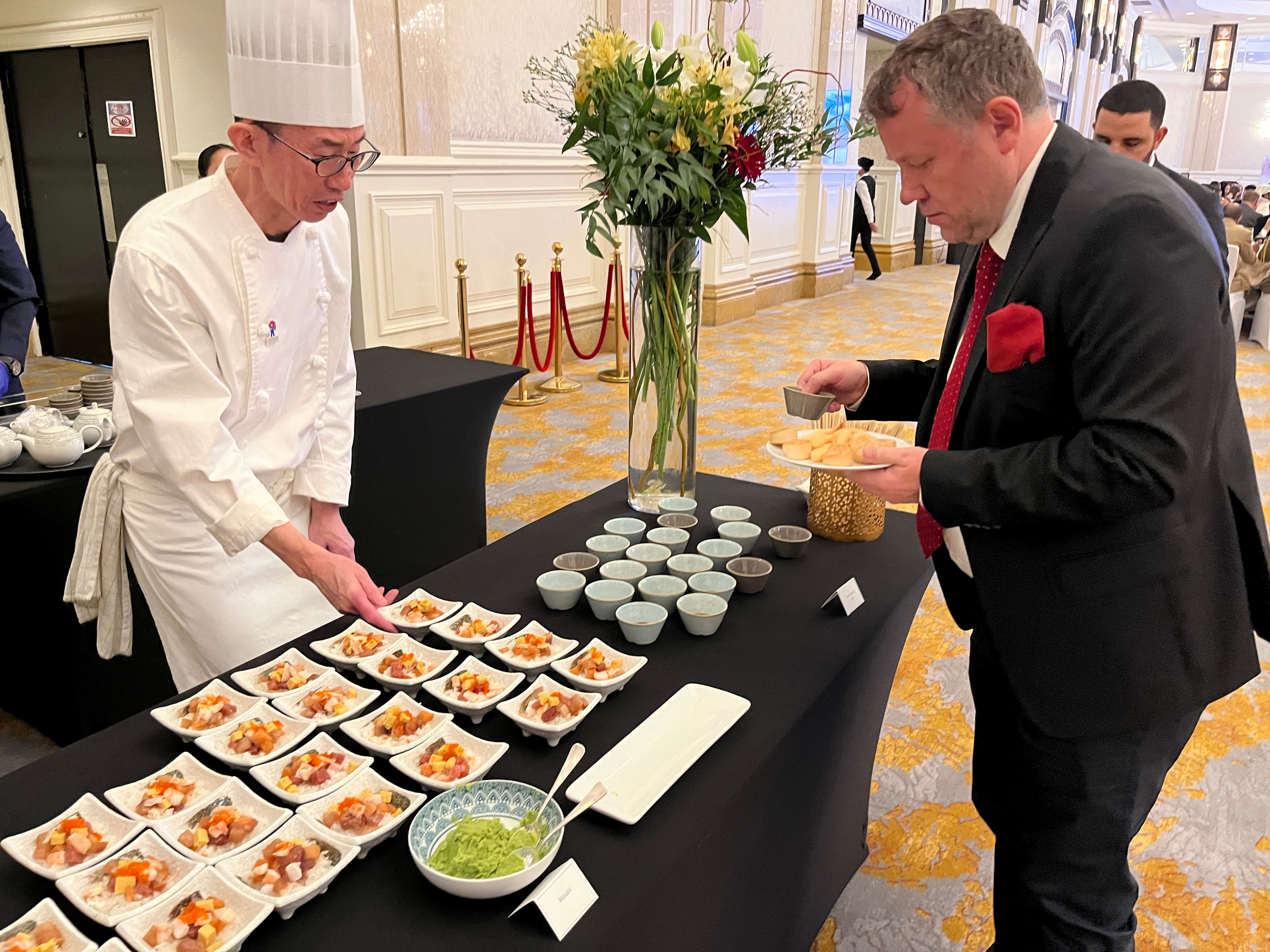 Many guests enjoyed Japanese food including Japanese marine products, such as Chirashi-zushi served by the Ambassador’s Chef. In addition, many guests took commemorative photos in front of Ikebana flower arrangements, traditional kimonos, and Japanese umbrellas displayed at the venue.