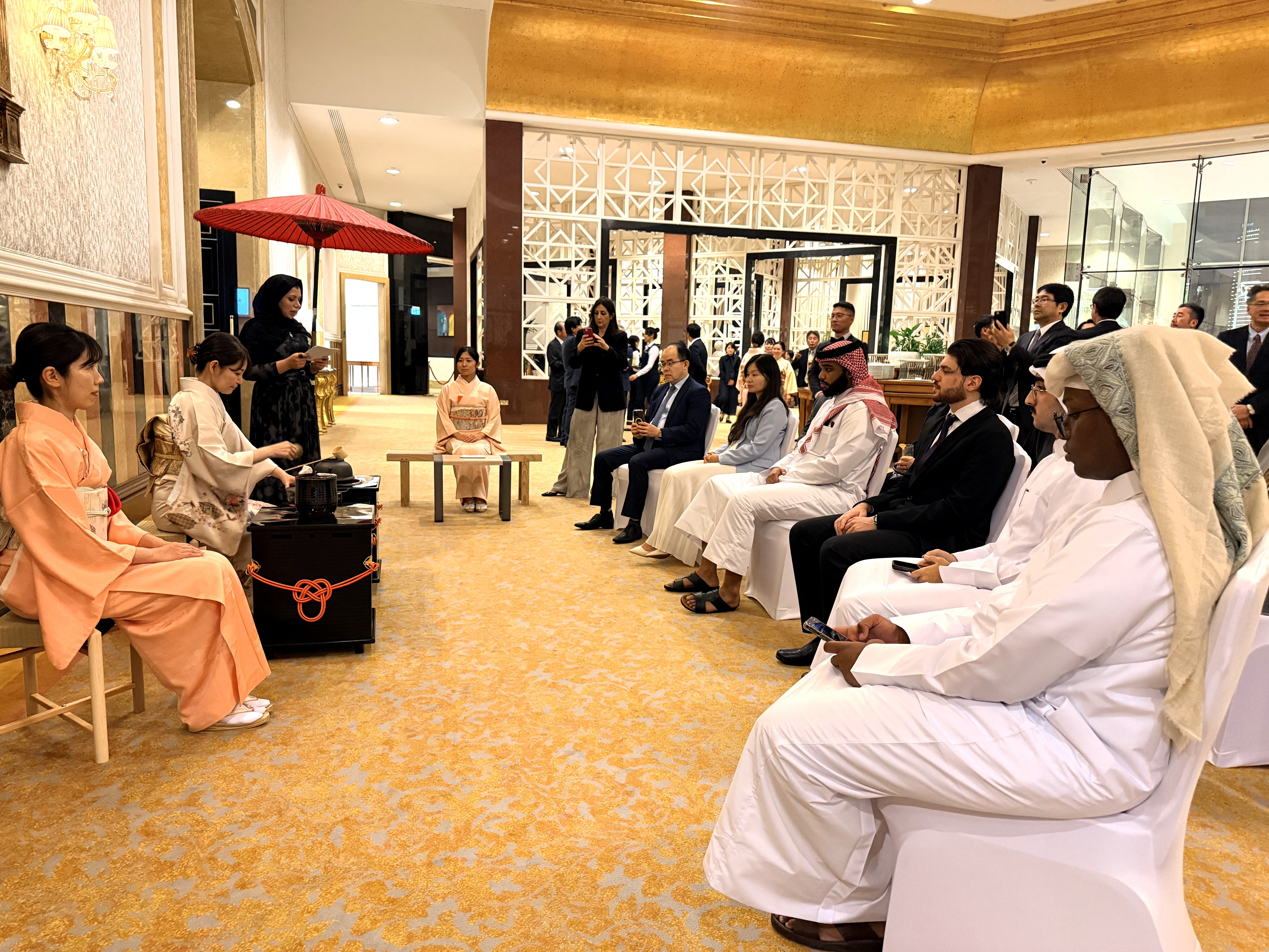 Guests enjoyed themselves with and deepened their understanding of Japanese culture through authentic Japanese cuisine and seafood prepared by the residence chef, complemented by a tea ceremony, Ikebana, and a performance by the Qatar Philharmonic Orchestra. The venue also featured well-received promotional booths from Japanese municipalities—including a message from Onagawa Town, which was badly affected by the Great East Japan Earthquake—and Japanese companies and organizations showcasing masu cups, matcha, and wagashi.