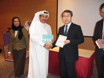 H.E. Ambassador Mr. Monji presented 48 Japan-related books to the Qatar National Library. The total number of books donated by the Embassy to the Qatar National Library since 1987 now reached 843. Mr. Abdullah Nasser Al-Ansari, Director of the Department of Public Libraries and Director of the Qatar National Library, mentioned that that new national library scheduled to be open in 2014 would set up the Japanese Corner.
