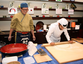 | Qatari gentleman trying Soba(Japanese Noodles) making | Group photo with Mrs. Junko Nanri (Front row, third from the left) and Mr. Kiyohisa Nanri (Front row first in the right ) ,JUNKO restaurant |